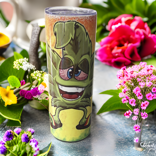 Take your Bud everywhere you go with our Marijuana Tumbler. This Cannabis Pot Leaf Mug features a super happy and dry eyed, green Mr. Bud on an orange and yellow background.